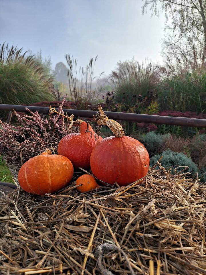 Dynie wędrują po ogrodzie do falujących i czarujących miskantów.